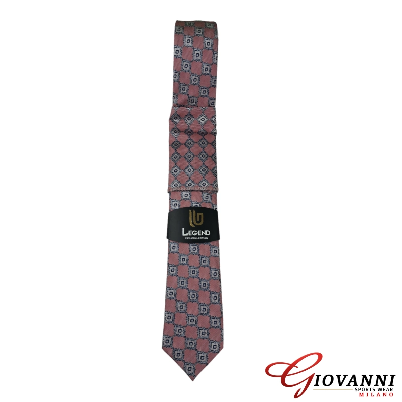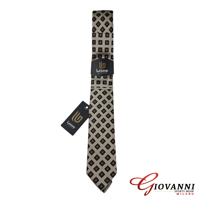 Πρόκειται για μια γραβάτα με επαναλαμβανόμενο γεωμετρικό μοτίβο από μικρά ρόμβοειδή σχήματα.Περιβάλλεται από καφέ και μαύρες λεπτομέρειες